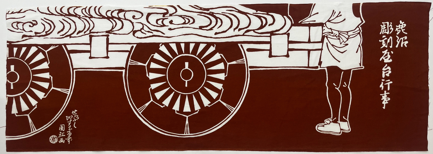和楽器集団「切腹ピストルズ」の飯田団紅 総隊長 がデザインし、布地は中川染工場(宇都宮市)の伝統技法「注染」で茶色に染め上げました。絢爛(けんらん)豪華な彫刻や腰丈ほどの大きな車輪、それを引く若衆の姿が描かれています。