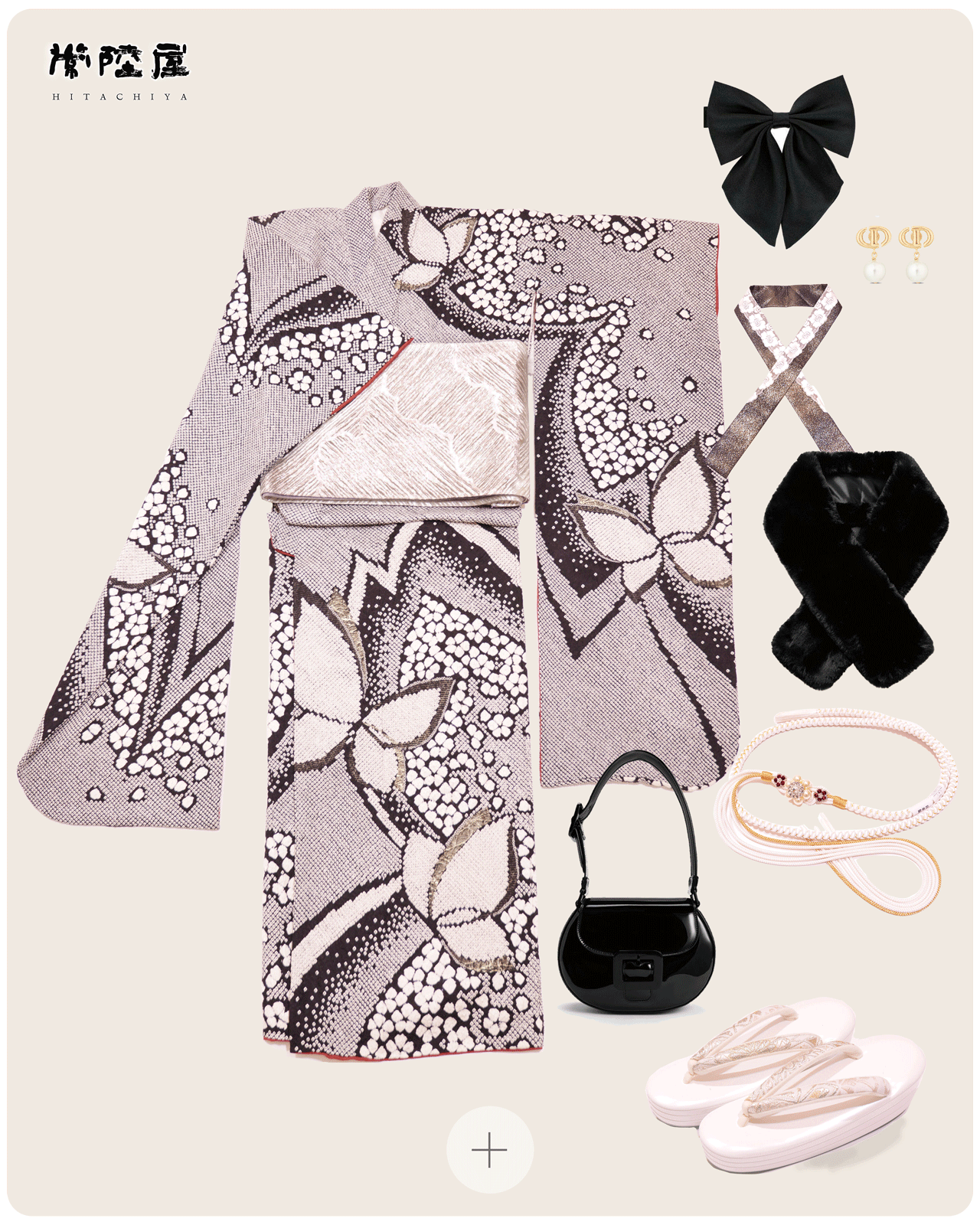エレガンスとモダンを合わせる和の装い。クラシックな和柄に現代のアクセントを加えた上品なスタイル。黒のアクセサリーが全体を引き締め、洗練された印象に。