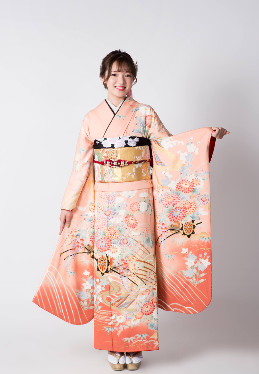 柔らかな華やかな桜色の振袖に花々が舞い踊るデザインが、あなたの可愛らしさを引立てます。ゴールドのアクセントが上品さをプラスしています。